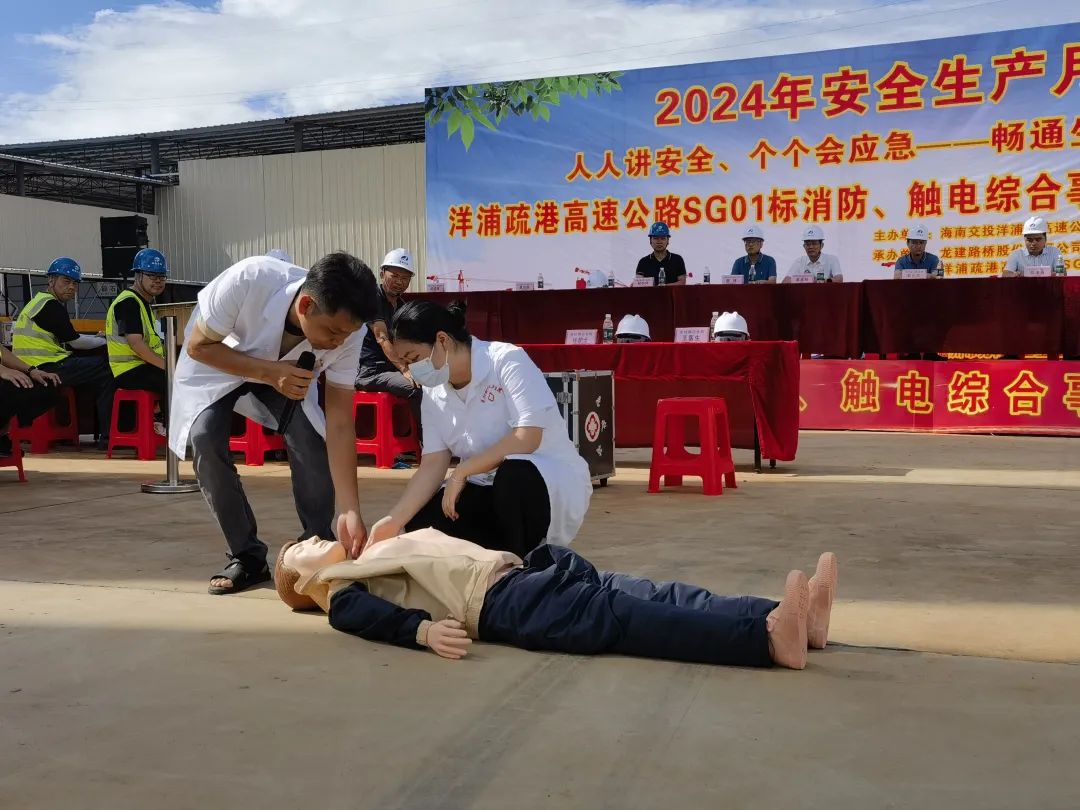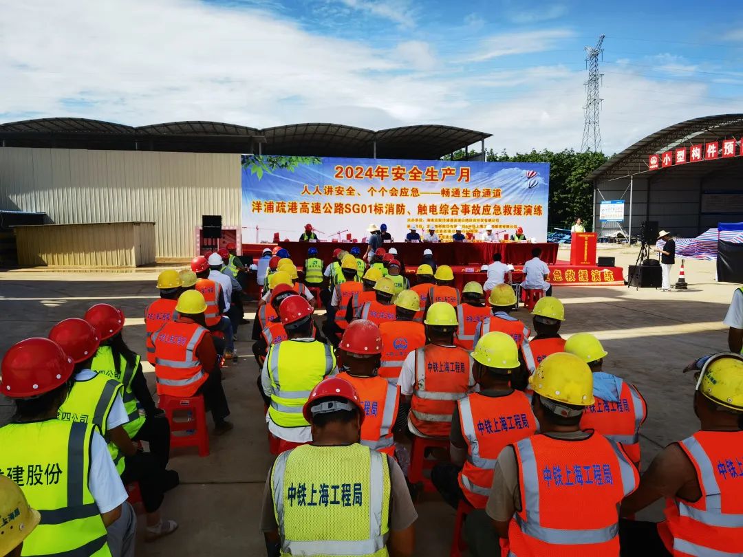 龍建路橋股份有限公司&中鐵上海工程局集團有限公司洋浦疏港高速公路SG01標項目經理部開展消防、觸電事故綜合應急救援演練,旨在全面提高消防、觸電事故的應急處置能力。