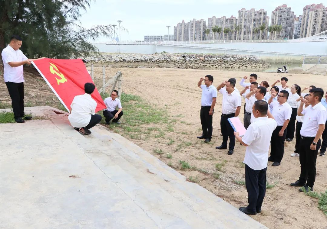 白馬井鎮渡海先鋒營登陸點海風輕拂,暖風襲來。紀念碑前,環島旅游公路第十一工區項目黨支部書記陳剛以“微黨課”的方式,講述白馬井鎮渡海先鋒登陸點的光輝事跡,追憶革命先烈“搶灘精神”。全體黨員整齊肅立,鞠躬緬懷,敬獻鮮花,重溫入黨誓詞,進一步筑牢信仰之基、匯聚奮進力量。
