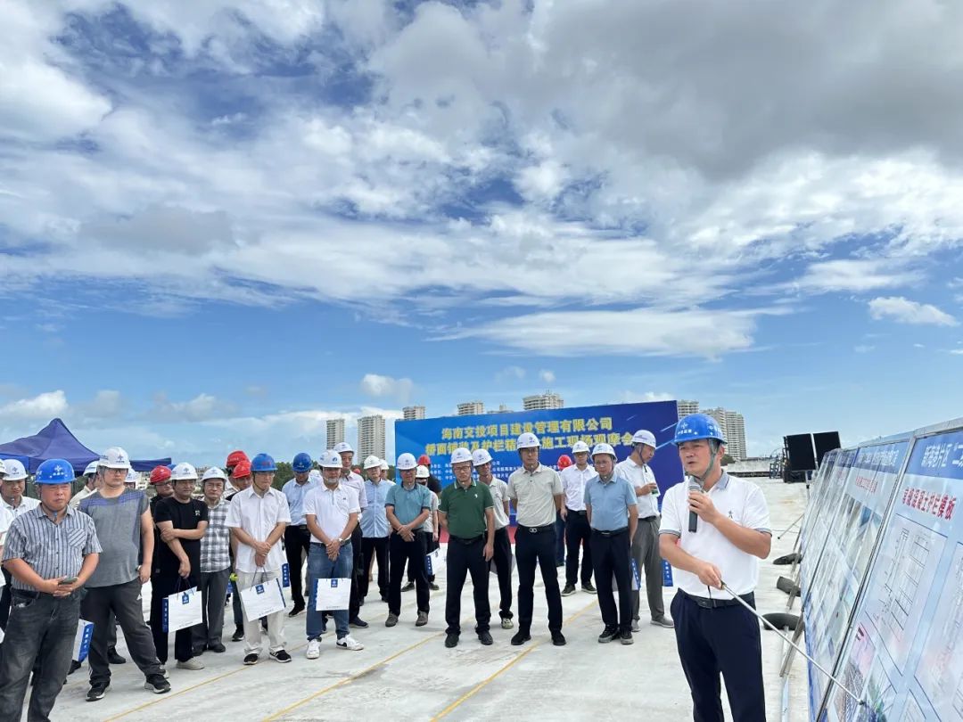 為全面提升橋面鋪裝和防撞護欄工程實體施工質量,7月16日,海南交投項目管理公司橋面鋪裝及防撞護欄精細化施工現場觀摩會在海口新海港片區“二線口岸”集中查驗區專用通道新建工程項目(以下簡稱“二線口岸項目”)TJ01標永慶大道高架橋成功舉辦。項目管理公司領導班子、各部門負責人,12個在建項目代建單位負責人、監理單位負責人、中心試驗室負責人、施工單位負責人、項目總工及相關班組負責人共計120余人參加觀摩。