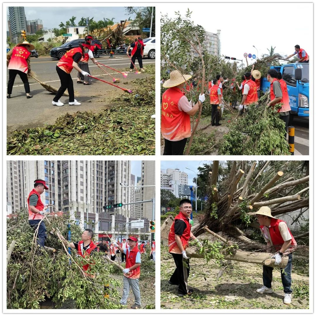 在大英山西四路與大英山西二街交匯路口,受臺風影響,隨處可見路旁樹木倒伏,樹葉、垃圾散落,交通受阻較為嚴重,急需救援力量。海南交投黨員志愿服務隊到達現場后,分成5組,積極配合社區工作人員,在附近路段開展道路清障、樹木搬運和垃圾清掃工作。烈日當空,志愿者們肆意揮灑汗水,雖身體疲憊,但熱情始終高漲,只見他們分工明確,熱火朝天,有的使用電鋸等工具對倒伏的樹木進行分段切割、修枝,有的將木塊、樹杈搬運裝車,有的將落葉垃圾清掃成堆,同時還化身交通勸導員,提醒過往司乘人員注意安全。