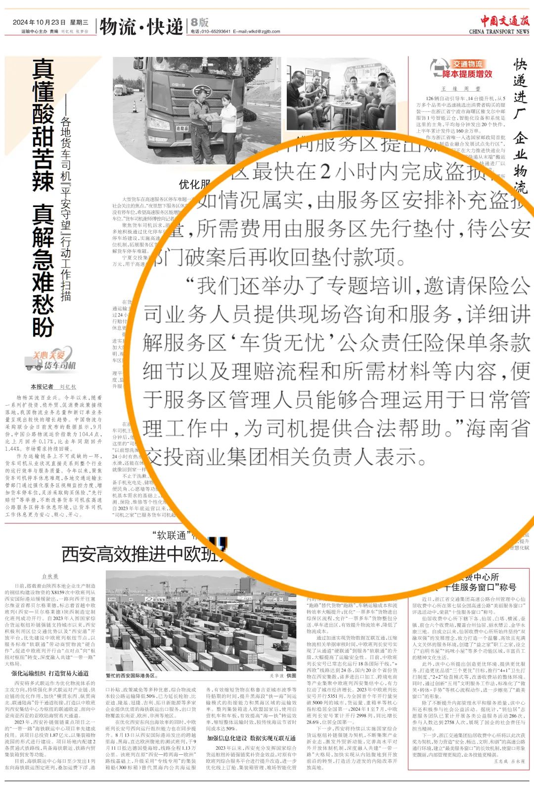 《中國交通報》于10月23日在“物流·快遞”版面刊發全國各地開展“關心關愛貨車司機”情況,其中報道介紹了交商集團開展“車貨無憂”公眾責任險相關工作。該項工作是繼公司成功引進“服務區+重卡換電”服務以及持續完善“司機之家”等服務設施建設后,又一項針對物流貨車群體的重大便民服務舉措,進一步提高服務區的綜合服務保障能力,提升貨車司機的滿意度。