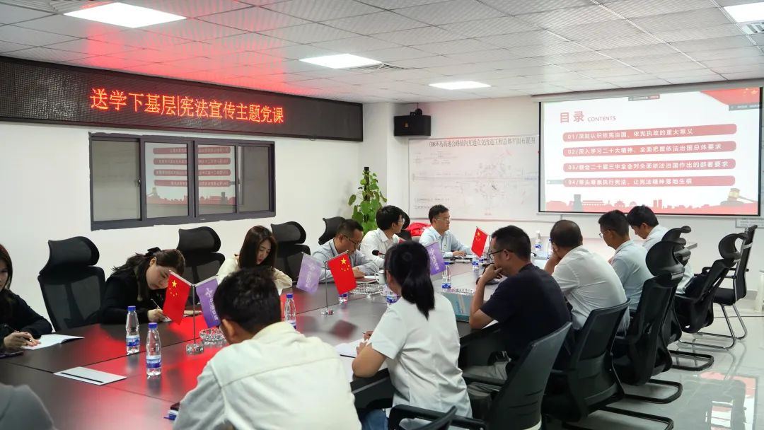 期間,全體人員共同觀看了憲法宣傳視頻《我和憲法》。課后,鄒威波一行來到施工現場開展憲法宣傳活動,為一線工作人員、農民工講解“什么是憲法、憲法規定了哪些內容、憲法的作用、憲法與普通法律的區別”等內容,并發放憲法知識科普宣傳冊。