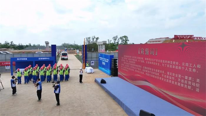 活動中,建設單位代表帶領全體參會人員作“安全生產月”莊嚴宣誓,鏗鏘有力的宣誓,表達了全體建設者全力做好安全生產工作的堅定決心。