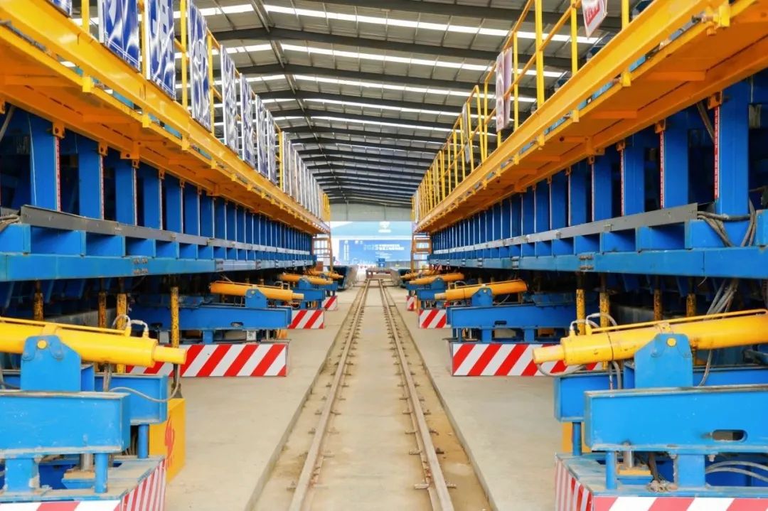 洋浦疏港高速項目SG02標段承擔著1168片預制箱梁的生產重任,項目團隊在建設過程中攻克多項技術難關,構建“技術研發-智能制造-品牌塑造”全鏈條創新體系。一是通過集成移動臺座系統、智能液壓模板、智能振搗系統、智能蒸養系統及智能張拉壓漿系統等技術,實現占地面積縮減24%、臺座數量減少55%、模板用量降低50%、工序耗時壓縮62.3%的顯著效益。二是創新應用透明蒸養棚技術,適應海南特殊氣候條件,確保蒸養后混凝土強度及彈性模量24小時內達到設計強度90%,將張拉周期由7天縮短至3天。三是配置大剛度整體不銹鋼模板體系,在提升梁體外觀質量的同時,有效減少大型特種設備使用頻率,顯著降低施工安全風險。