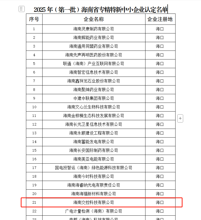 6月17日,海南省工業和信息化廳正式公示了2025年(第一批)海南省專精特新中小企業認定名單,海南交投旗下海南交控科技有限公司(以下簡稱“交控科技”)憑借在數字交通領域的技術創新和產品服務能力成功入選,進入省級“專精特新”中小企業行列。這標志著交控科技在專業化、精細化、特色化、新穎化發展道路上邁出了堅實的一步。