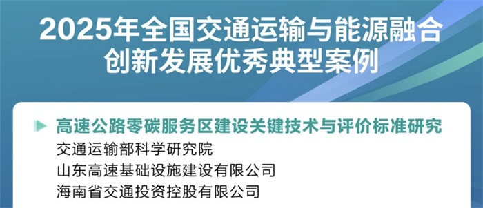 其中,“高速公路零碳服務區建設關鍵技術與評價標準研究”入選10大優秀典型案例。通過該研究,科學界定零碳服務區碳排放核算邊界,形成符合海南特點具有可操作性的零碳服務區關鍵技術方案,指導海南零碳服務區建設,并在海南率先成功打造馮家灣零碳服務區示范工程,樹立了零碳服務區建設樣板。