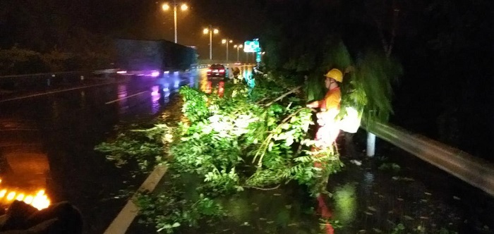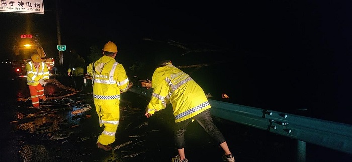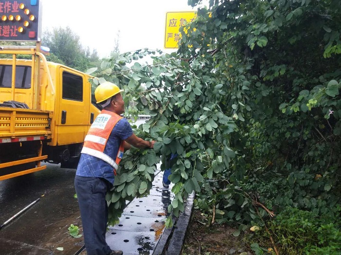 風雨就是命令,險情就是戰場。在疾風驟雨中,交控養護公司黨員干部沖鋒在前,不分晝夜、堅守陣地,確保過往車輛安全。瓊海是這次臺風的登陸中心,瓊海管理站站長李和森面對狂風暴雨,心急如焚,帶領管理站全體員工奔波在搶險救災第一線,已連續工作超過30個小時。13日晚8時,他剛踏進站內,來不及喘口氣,立馬接報瓊海立交K79至中原立交K94路段發生天橋廣告布被風吹落和多處路樹倒伏險情,他立刻帶領職工沖入暴雨中,趕赴現場處置清障。陵水管理站站長陳德海、副站長韋林芳帶領職工加強24小時不間斷路上巡查,餓了就一瓶礦泉水,塞一口方便面,迅速清理在風雨中倒伏在高速路面的樹木。定安管理站站長陳求欽是老黨員,因為連續的搶險和過度的疲勞,全身濕透、嗓子已嚴重沙啞,但依然堅守在路上,經過多小時連續奮戰,至13日23時,定安轄段的倒伏樹木已全部清理完成。