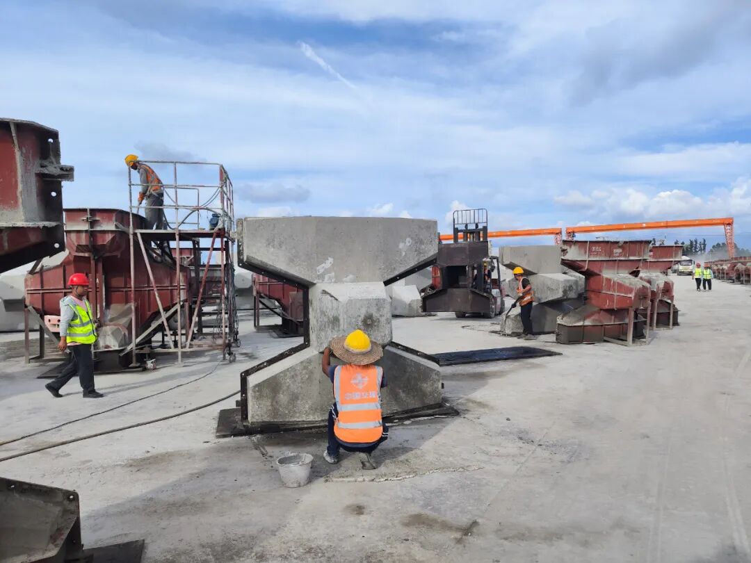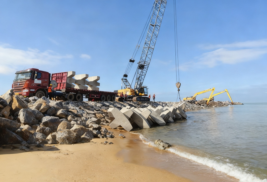 10月6日7時30分,東方市防災減災救災消防安全委員會解除臺風Ⅳ級應急響應,港航公司第一時間組織對八所港高排港區一期工程-防波堤項目開展全面安全隱患排查,在確認現場安全條件達標后,迅速推動項目恢復正常施工,全力搶回臺風延誤工期。走進項目施工現場,“搶時間、保質量、趕進度”的務實氛圍撲面而來:扭王字塊預制作業高效推進,施工人員嚴格遵循質量管控標準,有條不紊落實各項施工工序;北防波堤堤身拋填作業規范有序推進,起重機械精準完成石料拋填與扭王字塊吊裝、安放,為構筑港區穩固的防風防浪屏障奠定基礎。