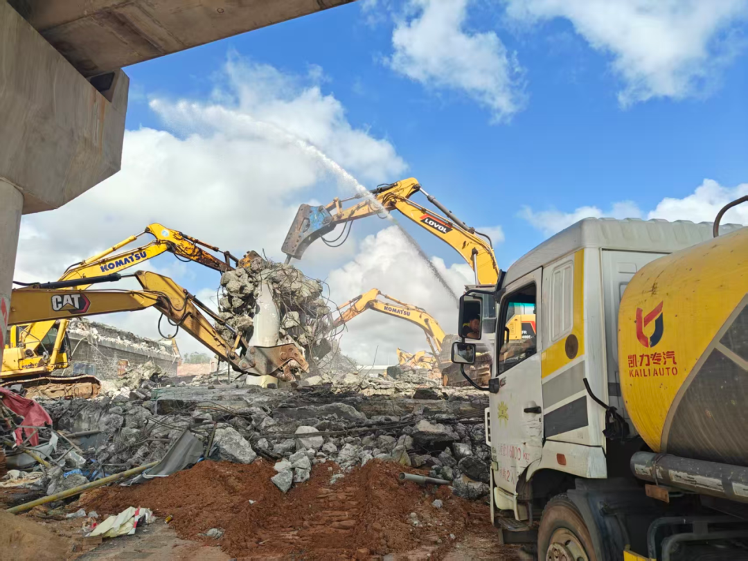 10月11日21時,隨著S308省道全封閉指令下達,拆除作業正式啟動。10臺液壓破碎機、2臺挖掘機協同作戰,防撞護欄拆除、空心板、蓋梁及墩柱破拆、廢渣清運等工序無縫銜接,12日12時,S308省道準時恢復通車,成功避開行車高峰期,實現精準施工與安全有序通行的“零沖突”。